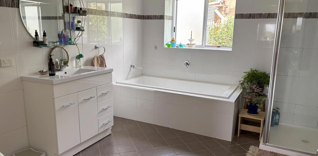 There is a huge family bathroom renovated in natural tones which features a large bath and separate shower.
