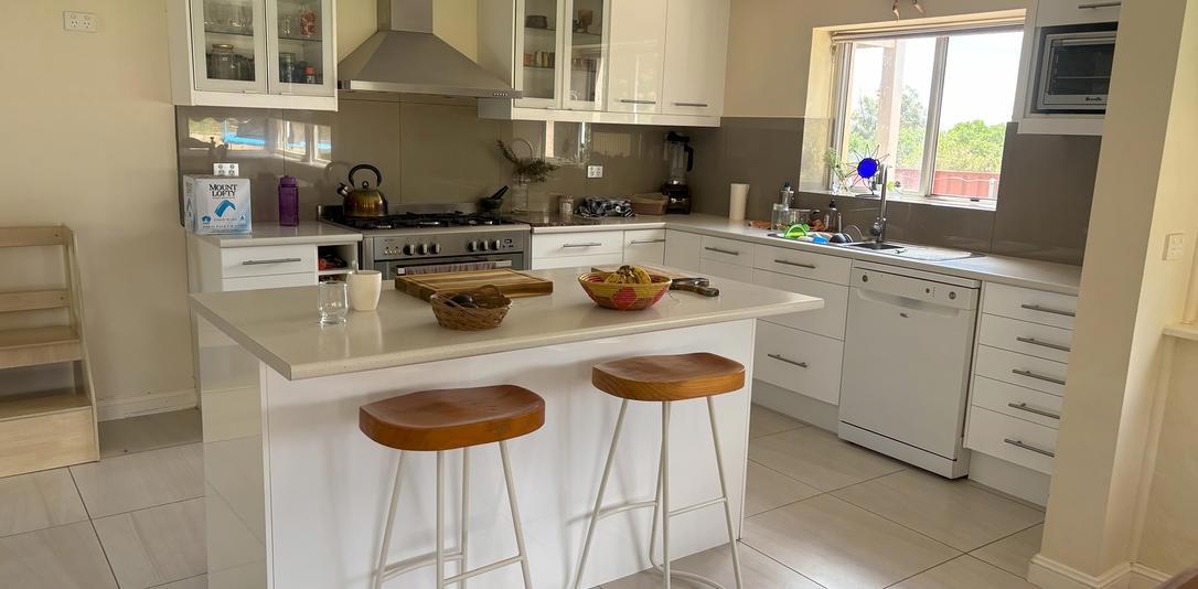 The kitchen features a 90cm gas up rights stove, ample cupboards and bench space plus island bench and all important dishwasher.