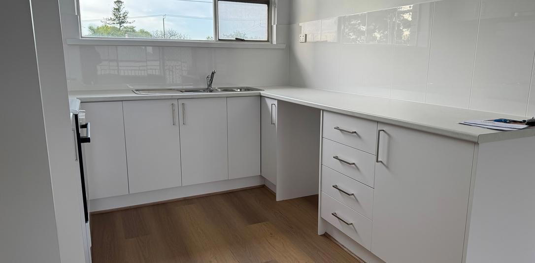 The kitchen is brand new with ample cupboards and space for a front loader washing machine.